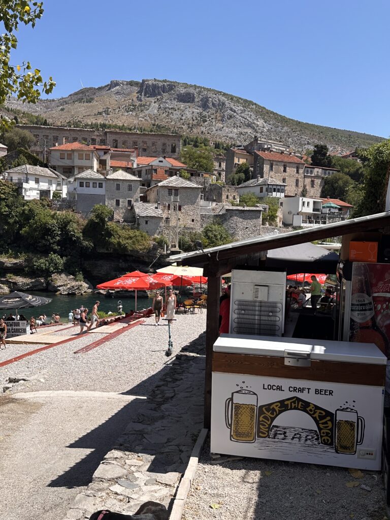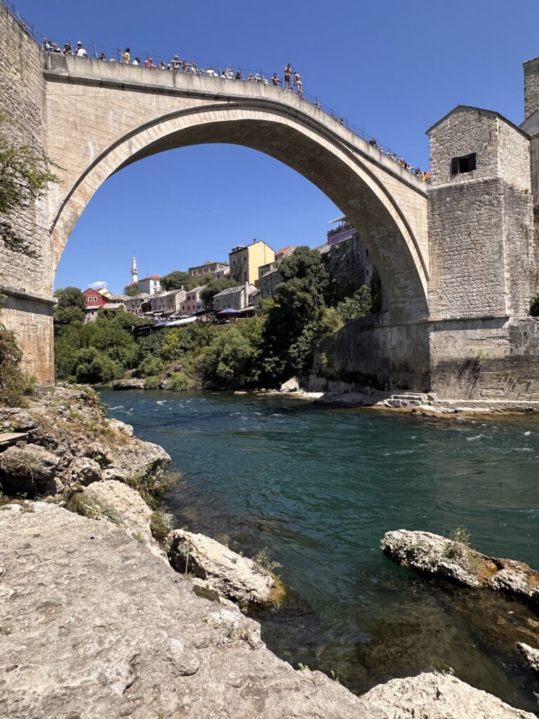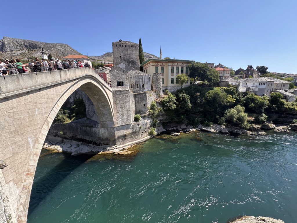 The symbolically-charged 16th-century Ottoman bridge, rebuilt after the 1990s war, draws hordes of tourists. For a closer look at the 24-meter-high arch, head down to the riverside (Mostar Beach) and find some shade under a tree.